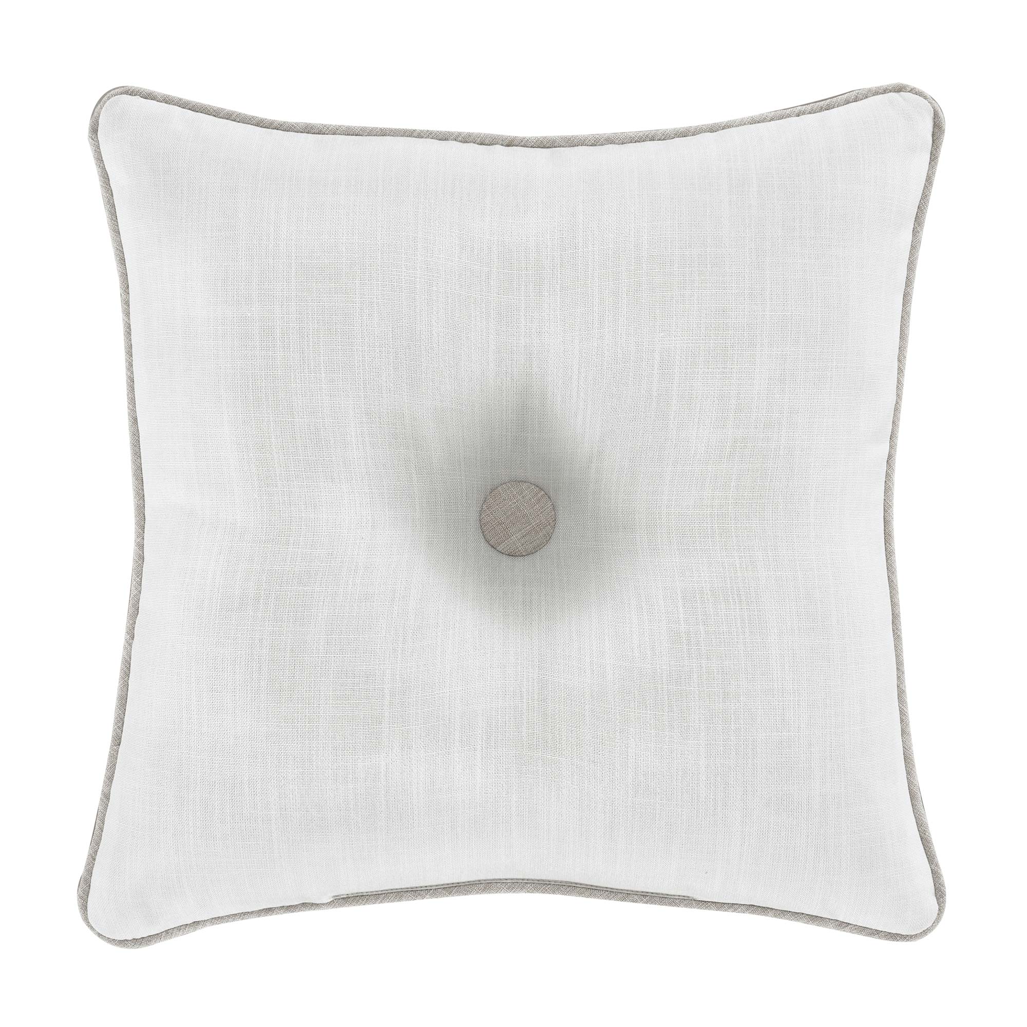 The Aimee 18 Inch Throw Pillow Is Crafted With Two Rows Of Cream Colored Gimp Details On A Beige Colored Faux Linen Base Fabric. The Reverse Use The Same Beige Colored Faux Linen As The Face And It Is Finished With A Beige Colored Piping For Added Detail.