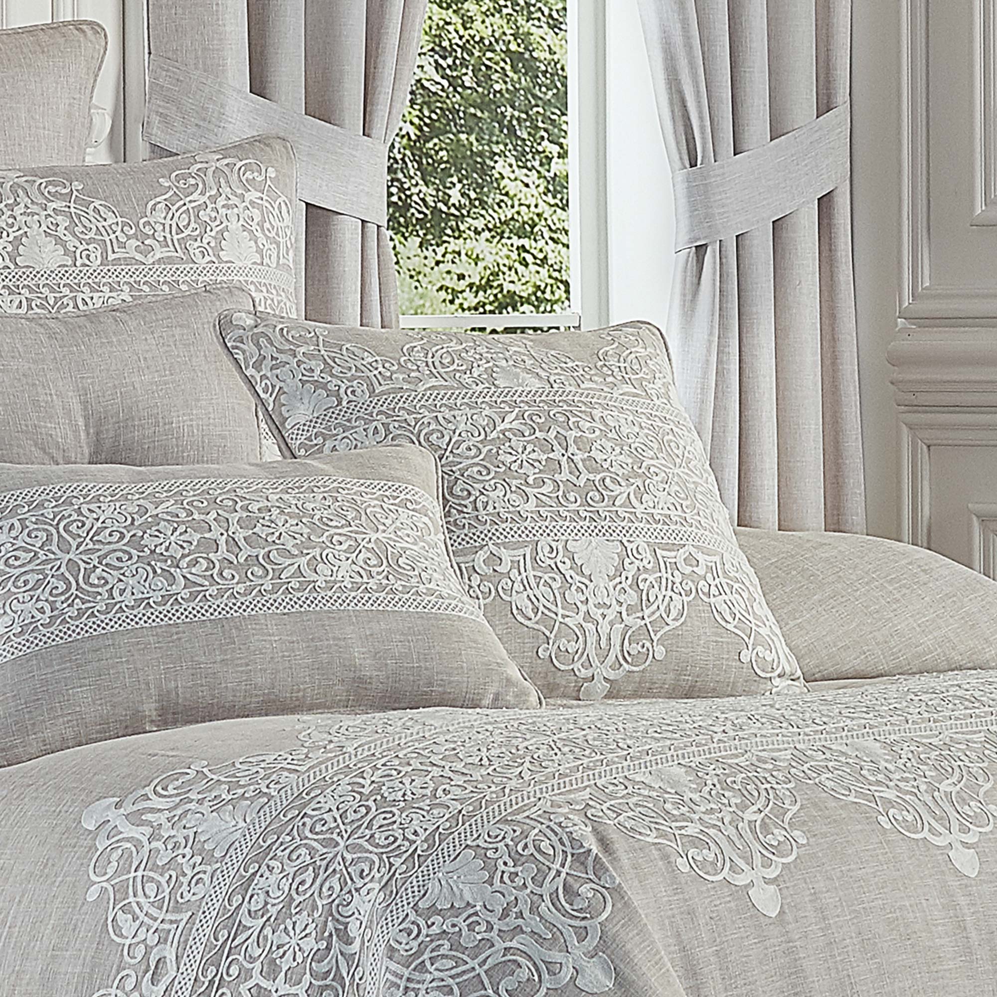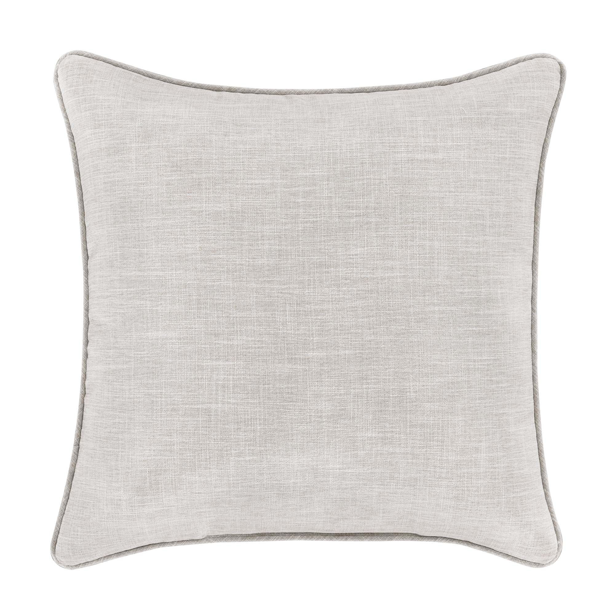 The Aimee 20 Inch Throw Pillow Features A Cream Colored Embroidered Damask On The Face And Reverses To A Solid Beige Colored Faux Linen. The 1/4″ Beige Colored Piping Finishes The Decorative Pillow. The Aimee Comforter Set And Window Treatments Are Available Separately.