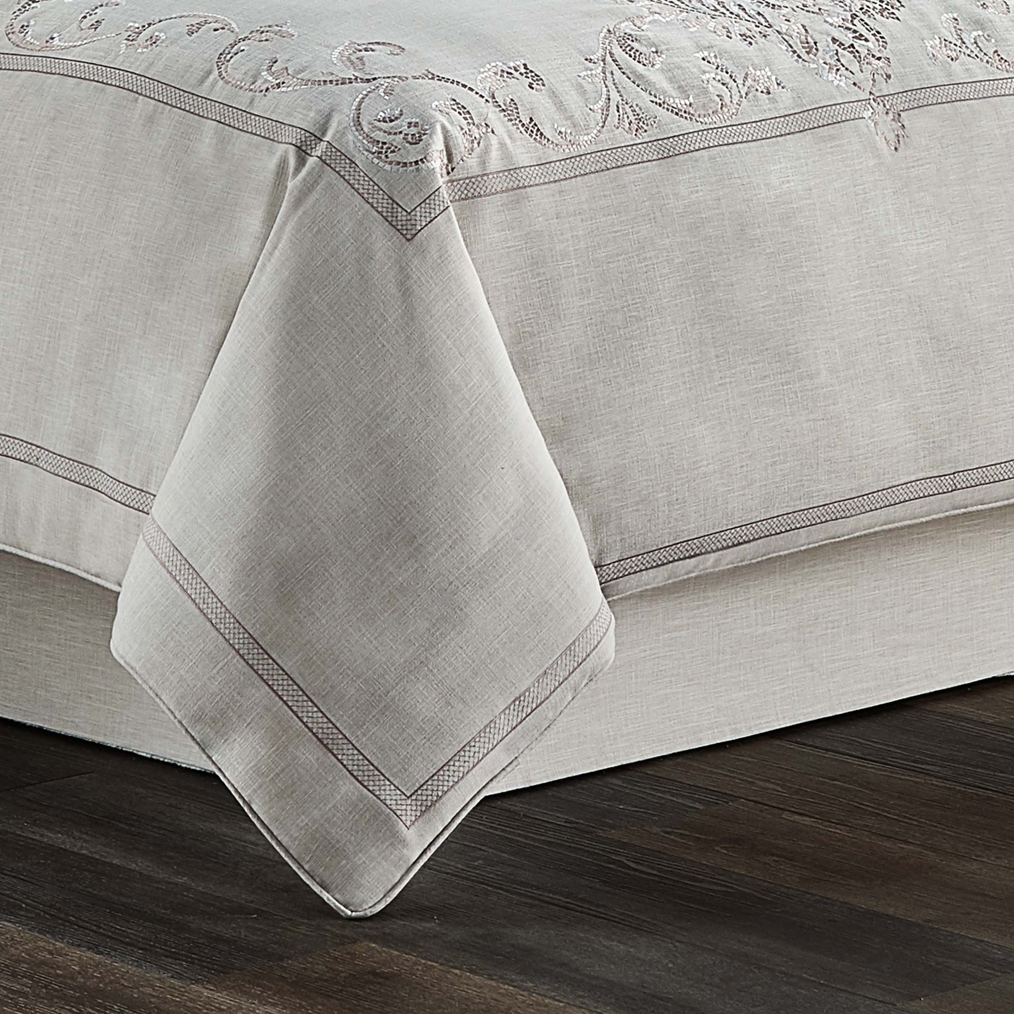 The Angeline 4 Piece Comforter Set Bedding Collection Is Simple And Classic With Its Fine Details And Luxurious Beige Faux Linen Fabric. This Beautiful Woven Heathered Effect Is Enhanced With A Traditional Blush Colored Damask And Border Embroidery In A Mosaic Technique. Paired With Matching Hidden Zipper Pillow Shams And An Engineered Beige Faux Linen Split-Corner Bedskirt, This Oversized Ensemble Will Add Updated Elegance To Your Bedroom Decor. The Reverse Of This Set Features A Plush Microfiber Dyed To Match The Beige Base Cloth On The Front And Is Finished With A Beige Faux Linen Piping For Added Detail. Pair This Collection With The Angeline Throw Pillows, Euro Sham, And Window Treatments By J. Queen New York For A Complete Look.