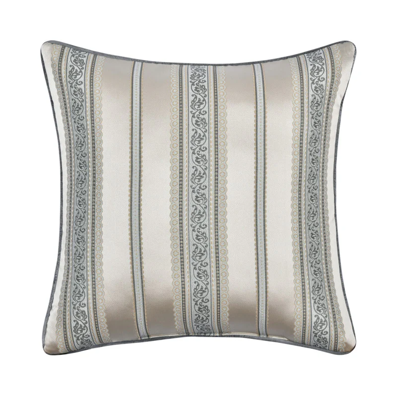 The Annabelle 20 Inch Throw Pillow features an elegant woven damask design in a stunning spa blue, gold, silver, and ivory colorway. This lovely accent pillow reverses to a woven vertical stripe for added decor versatility, finished with a velvet cord, which coordinates with the Annabelle Bedding collection.