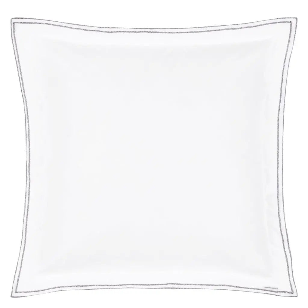 400 thread count cotton percale shams in crisp plain white bed linen with sophisticated embroidered detailing in a new black and white melange thread.