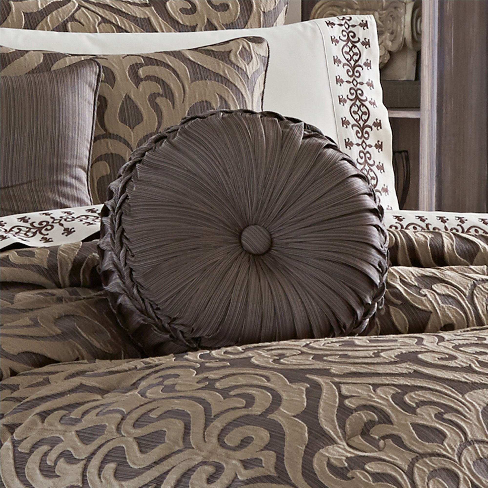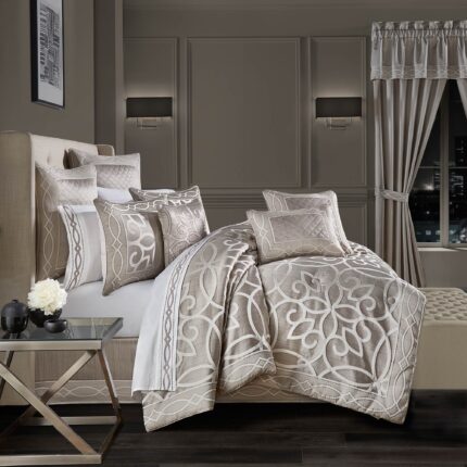 Add a touch of rich texture to your bed with this luxurious bedding Large-scale damask pattern is jacquard-woven for a unique 3D effect Pillow shams coordinate with top of bed Split corner bed skirt provides a tailored finish
