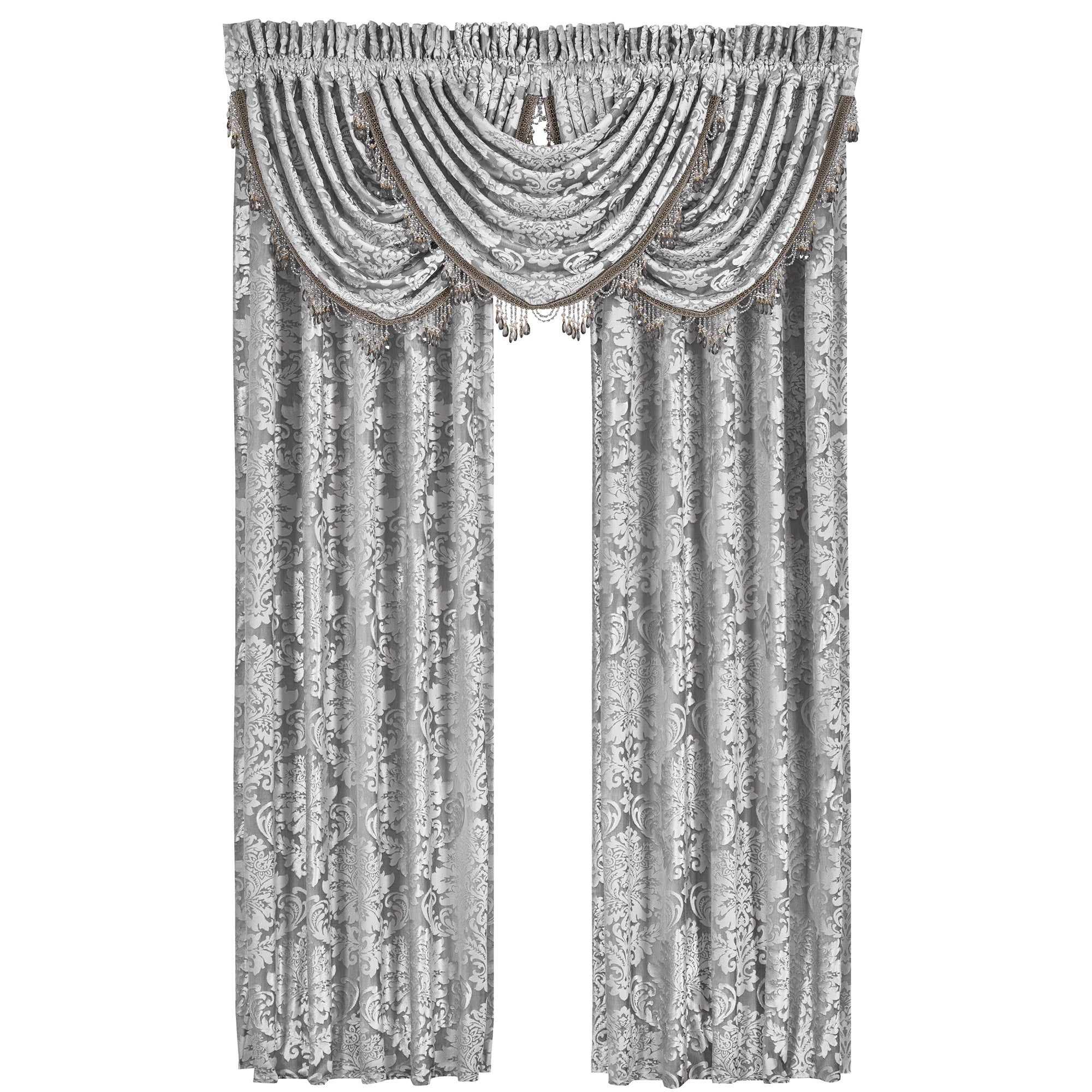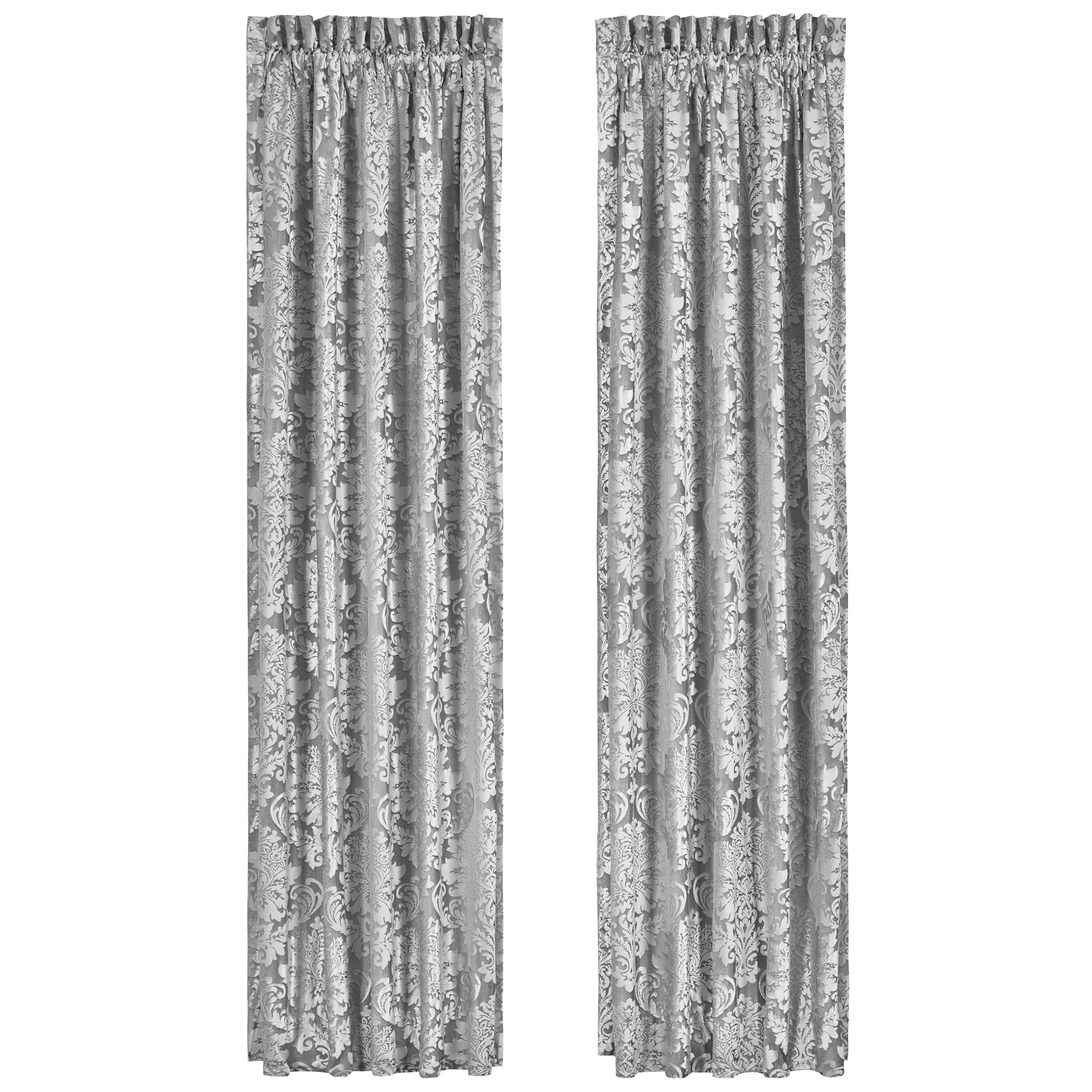 The drapery panels are carefully cut and sewn from the feature damask fabric insuring that the patterns match once hung. The panels measure 84” in length, a 3” rod pocket with a 3” header. They are lined with a solid white fabric and completed with tie backs cut and sewn from the diamond coordinating fabric.