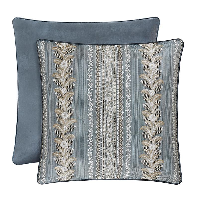 The crystal palace euro sham has an engineered floral stripe running vertical on the face. The sham reverses to a solid blue velvet. ¼” piping in solid velvet finishes the pillow.