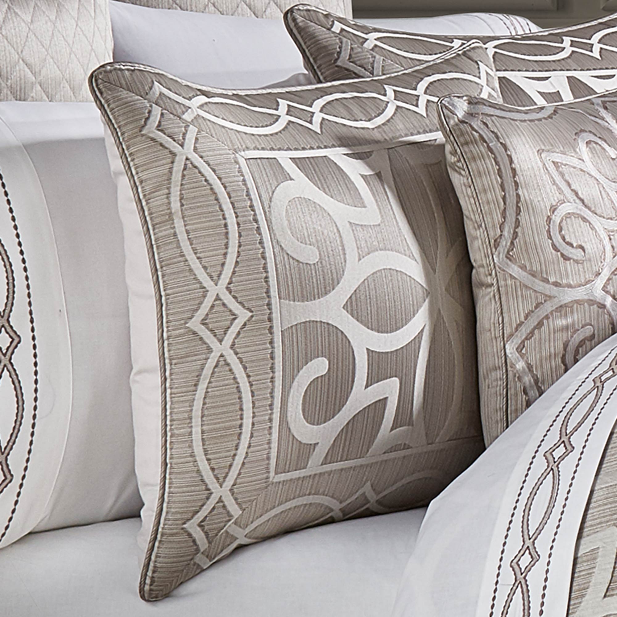The Deco 4 Piece Comforter Set Collection Features A Highly Constructed Sleek Engineered Jacquard With Bordered Edges. This Alluring Modern Geometric Motif Is Constructed With A Puff Technique Which Sits On A Lustrous Stria Satin Ground In Industrial Silver Tones. This Comforter Is Generously Oversized And Overfilled For A Sophisticated Look. The Matching Hidden Zipper Closure Pillow Shams Are Engineered With A Sleek Border Showcasing The Geometric Motif. The Bedskirt Has Extra Length And Is Constructed With A Split Corner Tailored Finish And The Coordinating Stria Satin Is Bordered With A Geometric Puff Jacquard Finish. Coordinate Deco Accent Pillows, Shams, And Window Treatments By J. Queen New York Are Available Separately.
