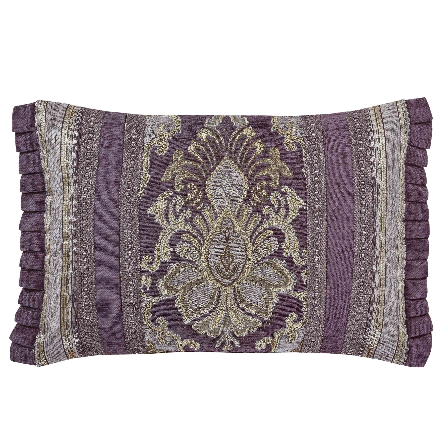 The dominique boudoir is beautifully pieced with a centered woven jacquard damask and a jacquard stripe border with lavender chenille fabric. This decadent pillow is embellished with a sparkling crystal tassel fringe and braided gimp to add a traditional luxury look to your decor. Pair this 23 x 15 inch pillow with the dominique bedding set by five queens court for a complete look.
