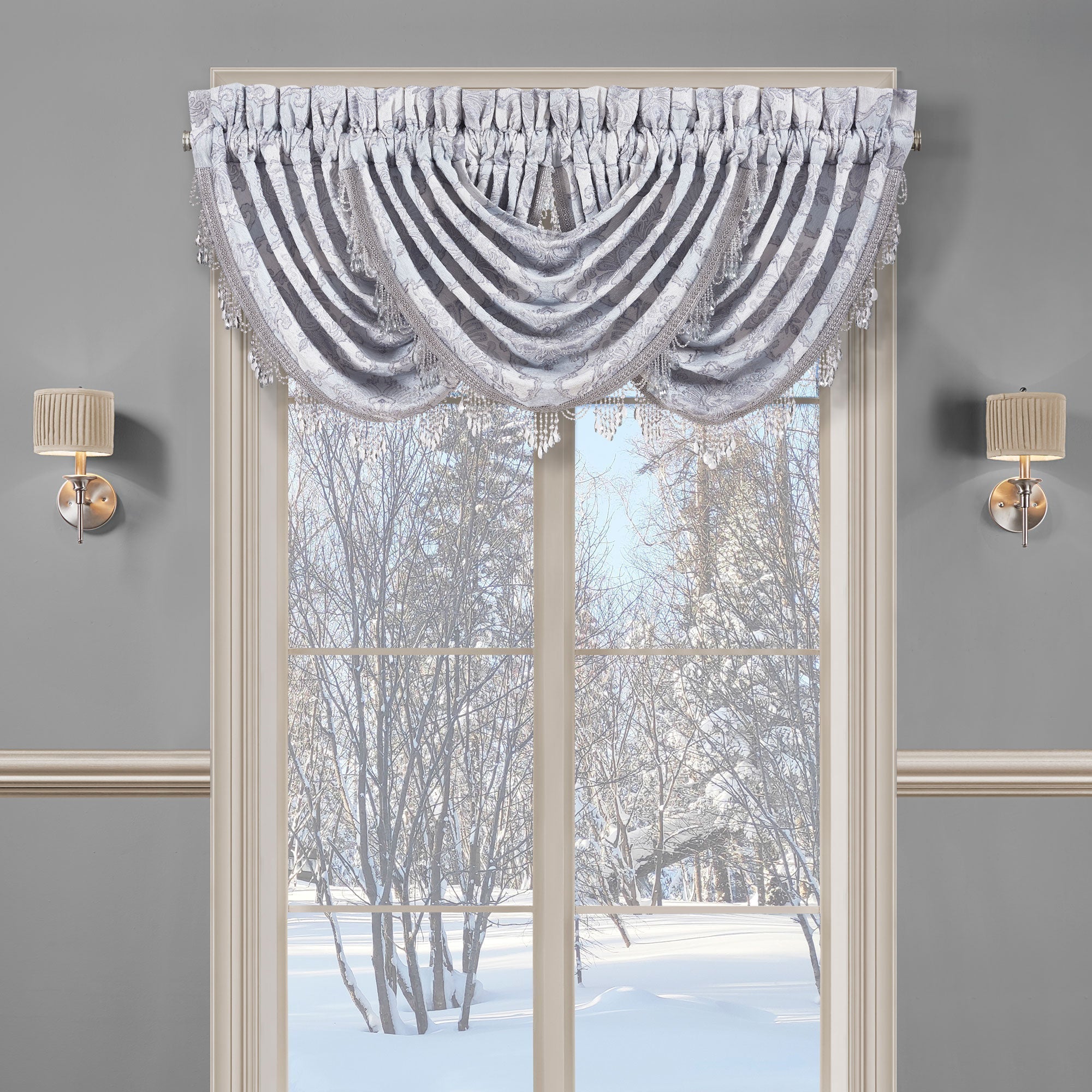 The Iceland Waterfall Valance Is Exquisite With Its Fine Details And Sophisticated Use Of Ice Blue And Silver Tones. This Beautiful Woven Jacquard Damask Valance Is Rich With Its 3-Dimensional Weave And Satin Finish. Embellished With A Sparkling Crystal Tassel Fringe To Add A Gorgeous Elegant Finishing Touch. Add The Iceland Window Panels And Bedding By J. Queen New York To Complete The Look.