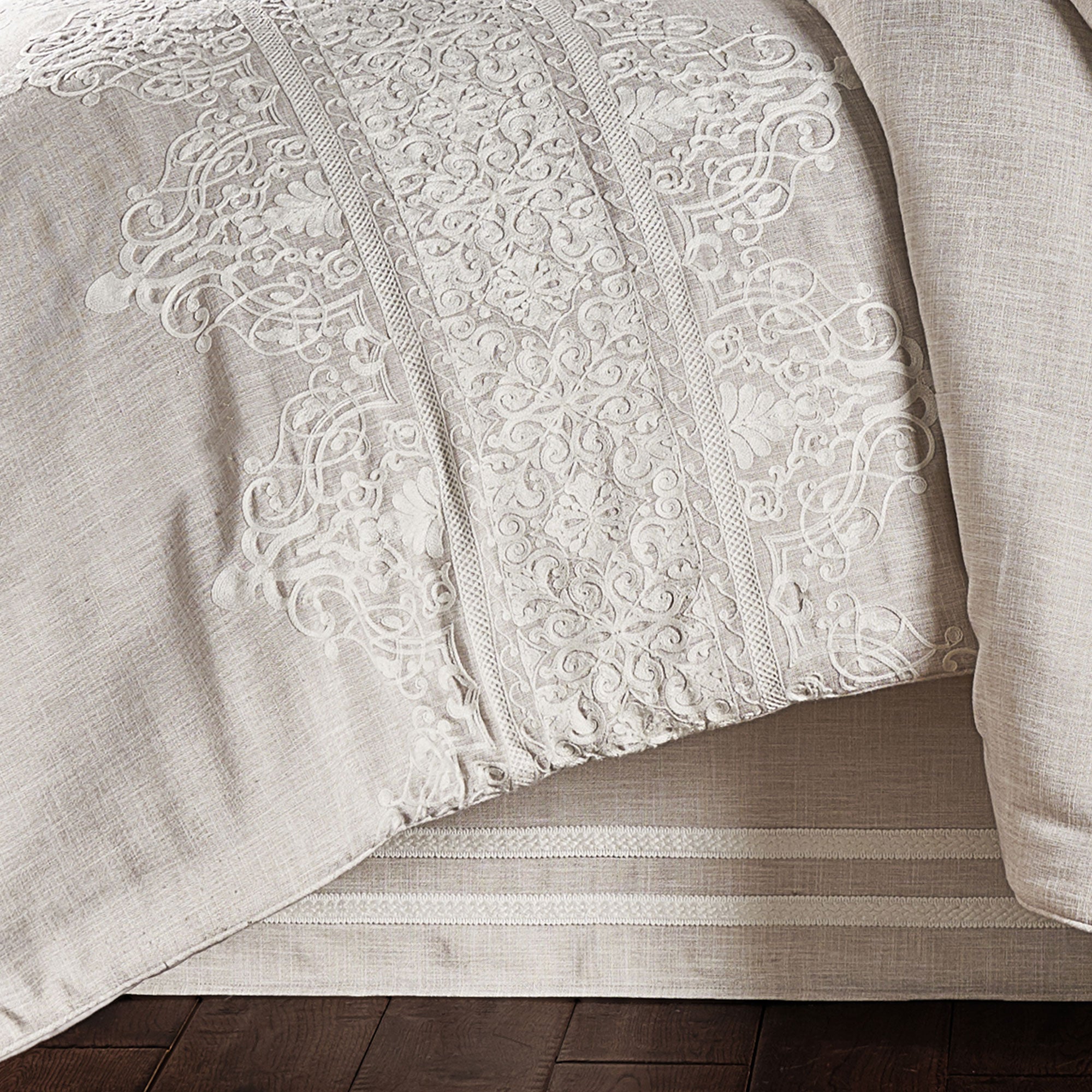 Four piece set includes one comforter and two perfectly matched padded pillow shams with a hidden zipper. Pillow shams are engineered, centering the embroidered damask and finished with 1/4″ beige piping. Bedskirt is solid faux linen beige with 2 rows of gimp running at the bottom with split corners and a 15″ drop.