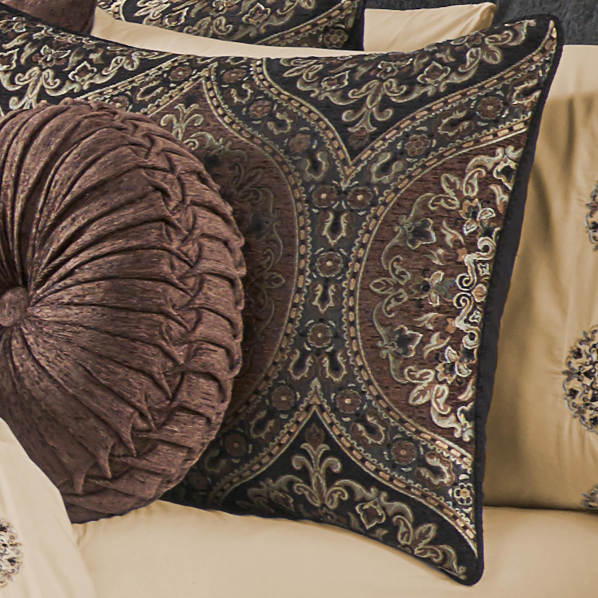 The Mahogany 4 Piece Comforter Set Bedding Collection Is Exquisite With Its Fine Details And Sophisticated Use Of Chocolate And Gold Colors. This Beautiful Woven Jacquard Medallion Ensemble Is Rich With Design House Quality Fabric And A Soft Chenille Finish. Paired With Matching Hidden Zipper Closure Shams And A Solid Black Chenille Split-Corner Bed Skirt, This Oversized Ensemble Will Add Timeless Style To Your Bedroom Decor. The Reverse Of This Set Features A Plush Solid Microfiber Dyed To Match The Black Base Of The Front Pattern And Is Finished With A 1/4″ Chocolate Chenille Piping. Pair This Collection With The Mahogany Throw Pillows And Window Treatments By J. Queen New York To Complete The Look.