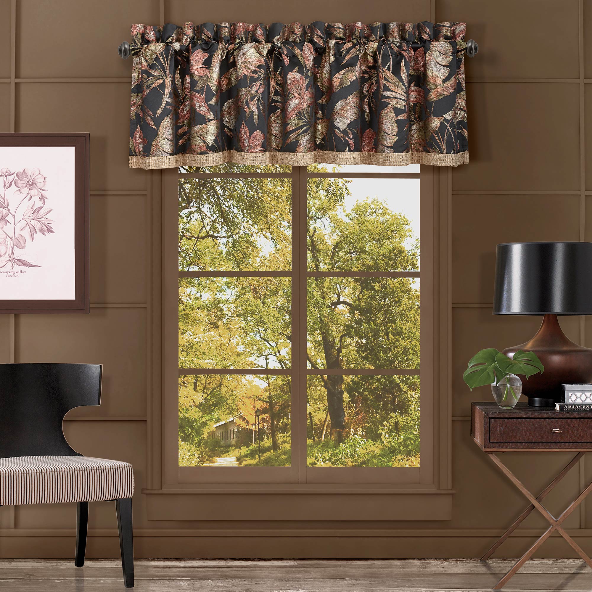 The Martinique Straight Window Valance Is Exquisite With Its Fine Details And Bold Use Of Black And Coral Tones. This Beautiful Printed Tropical Pattern Featuring Palm Leaves And Flowers Is Sophisticated Yet Fun. Finished With A Lovely Textured Gold Tweed Fabric At The Bottom, This Valance Is The Perfect Finishing Touch To This Grand Tropical Design. The 3″ Header And 3″ Rod Pocket Make This Valance Easy To Hang. Pair This Valance With The Martinique Window Panels And Bedding Collection For A Complete Look.