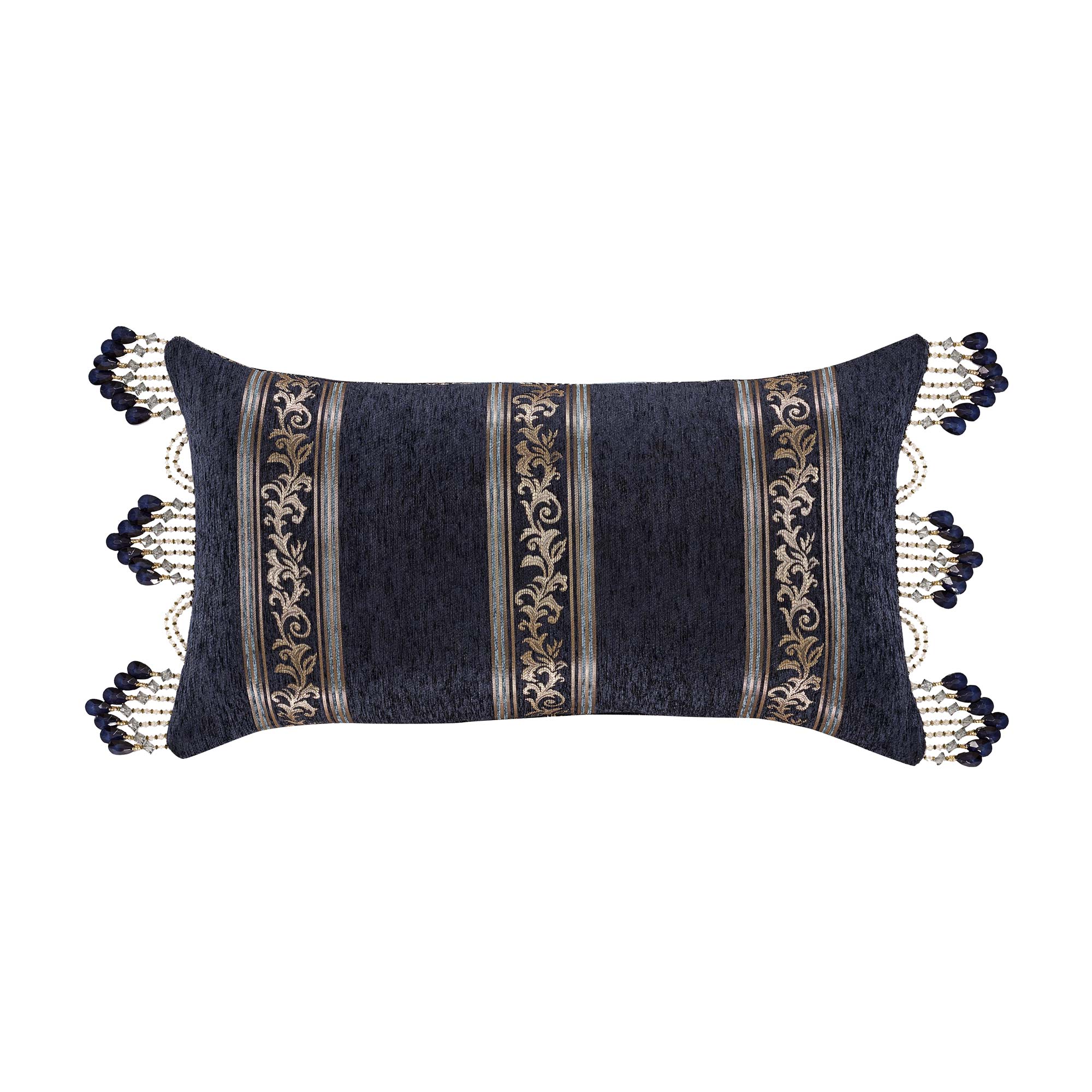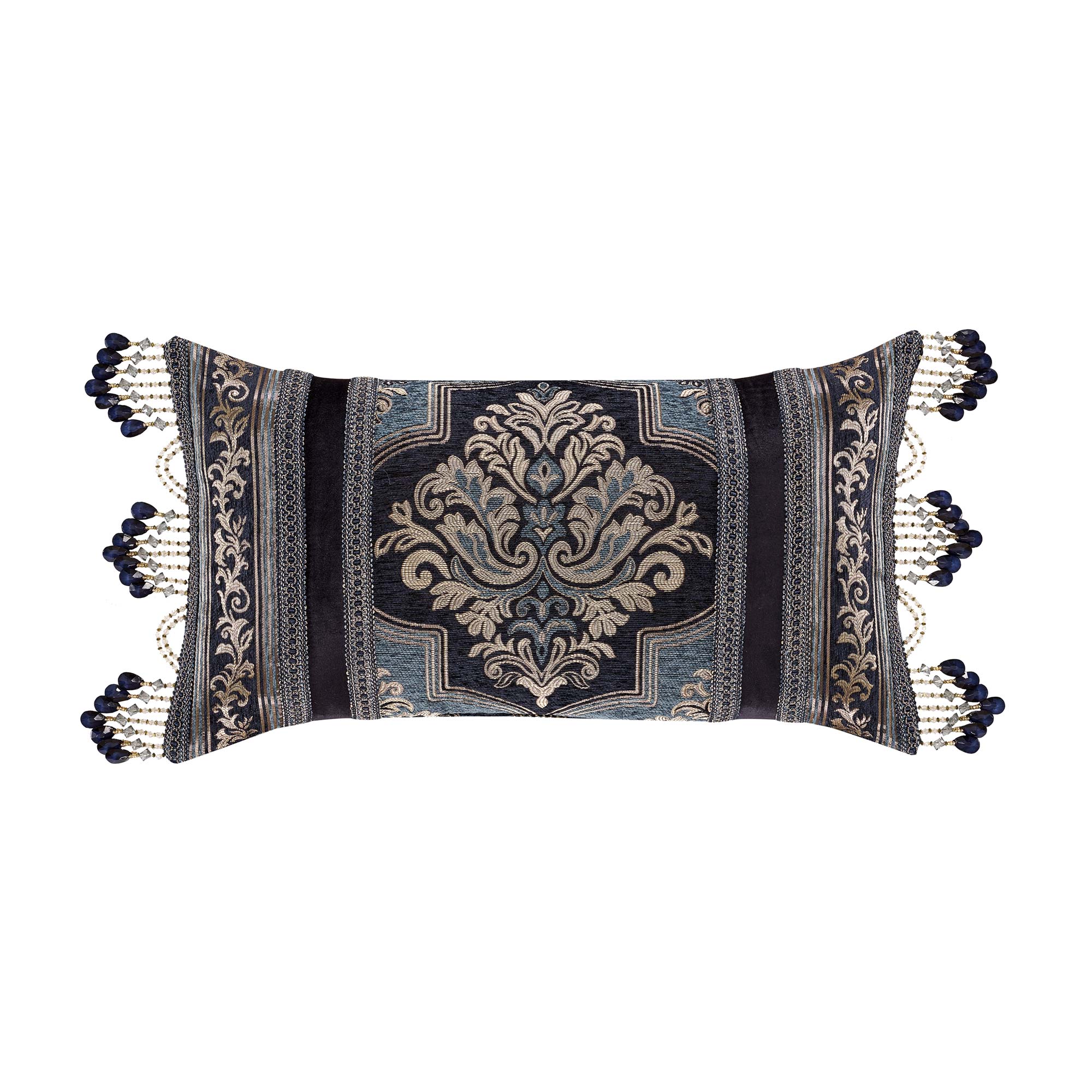 The Middlebury Boudoir Pillow Features A Woven Damask Framed With Indigo Velvet Fabric And A Vertical Scroll Stripe. Further Luxe Details Include A Gimp Accent With A Tassel Fringe, Reversing To A Vertical Stripe Pattern. Pair This Pillow With The Middlebury Bedding Set By For A Complete Luxe Look.