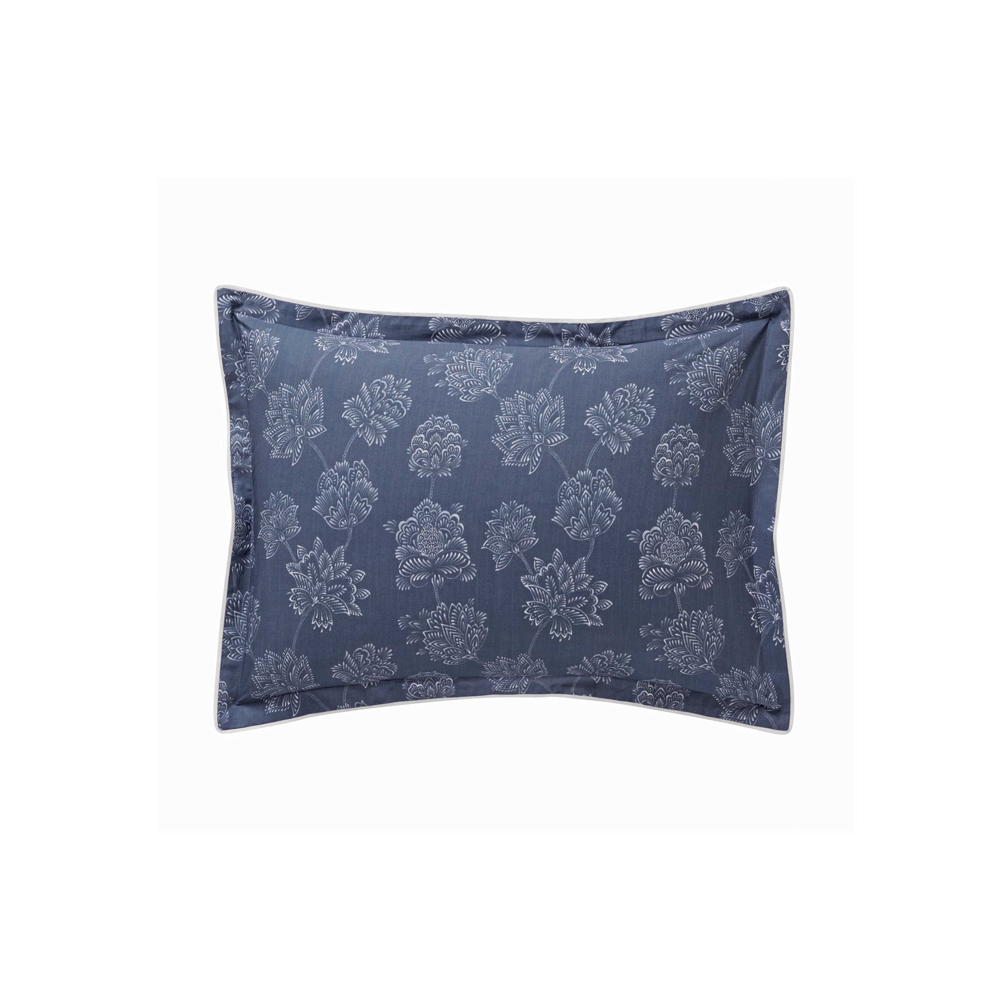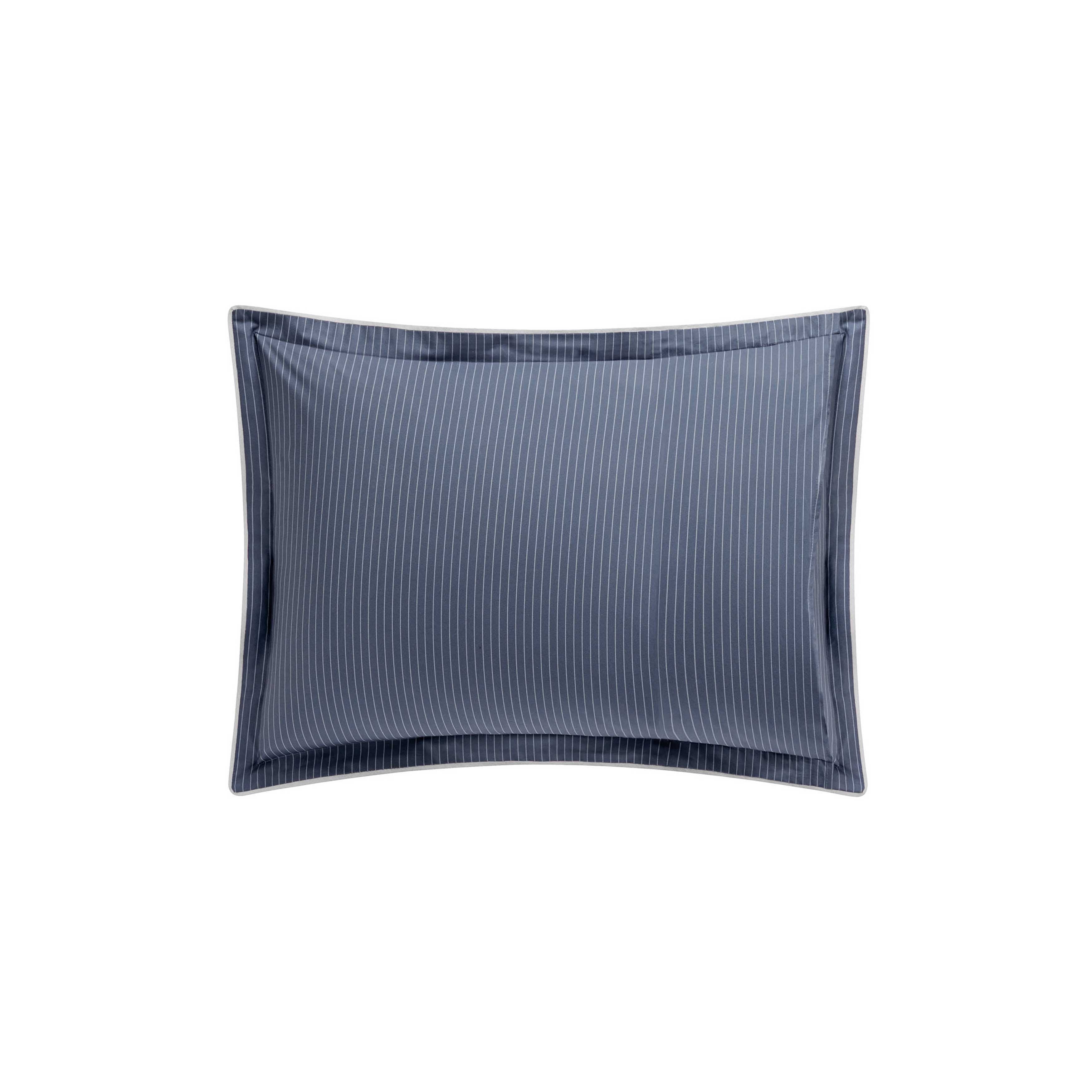 Nocturne gives free reign to an ornamental aesthetic by combining stylized florals and men’s wardrobe. The result is modern, and very handsome, a combination of Persian flowers and men’s suiting stripes. Both prints are on a denim blue background. Percale construction. Nocturne shams are embellished with a light beige coloured inset trim finishing detail. Nocturne shams are reversible. One side has the flowers print, the other side has the stripes print.