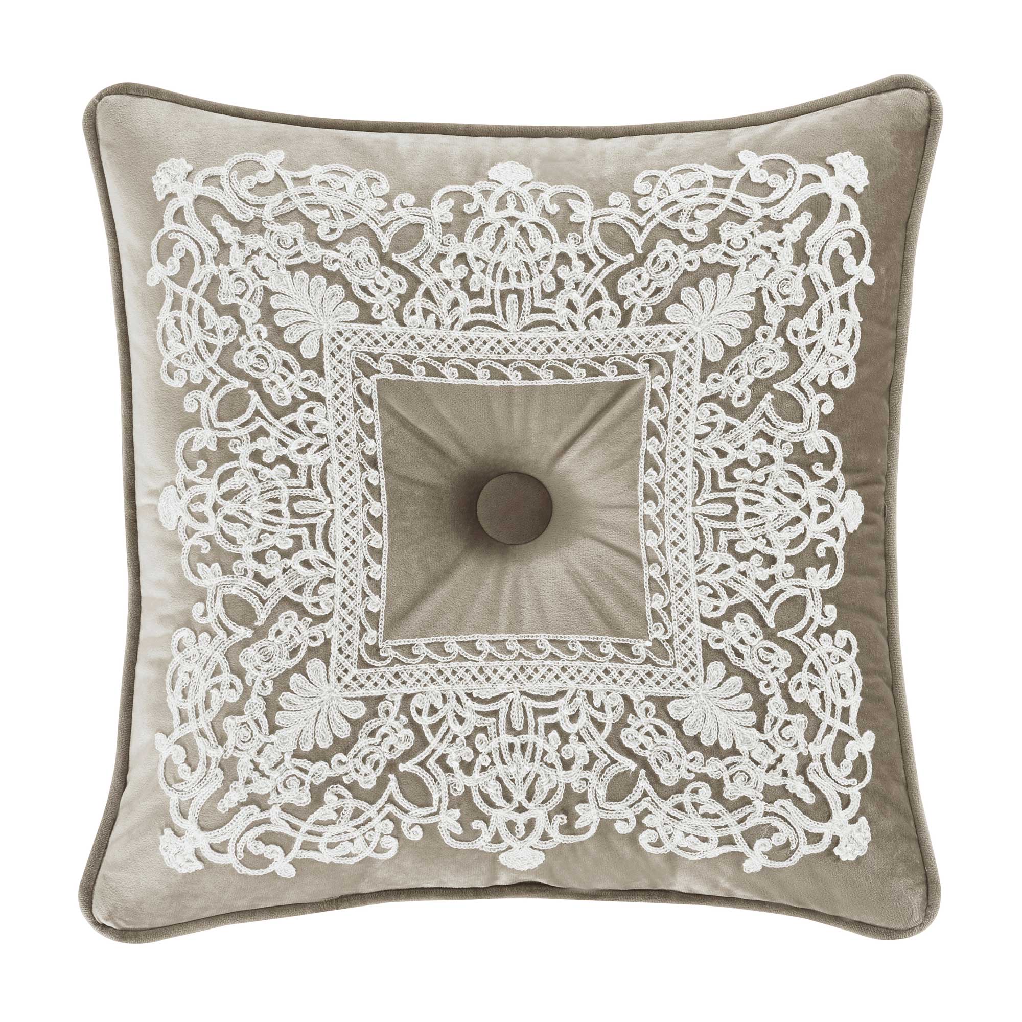 The Opulence 18 Inch Decorative Throw Pillow Features A Plush Solid Velvet Fabric In A Lovely Linen Color. Further Detailed With A Deeply Tufted Button Accent And Crewel Embroidery Framing The Accent Pillow. The Reverse Of The Pillow Is Crafted With A Solid Velvet In A Cream Color And Is Finished With 1/4″ Piping In A Linen Velvet. Pair This Pillow With The Opulence Bedding Set By J. Queen New York For A Complete Look.
