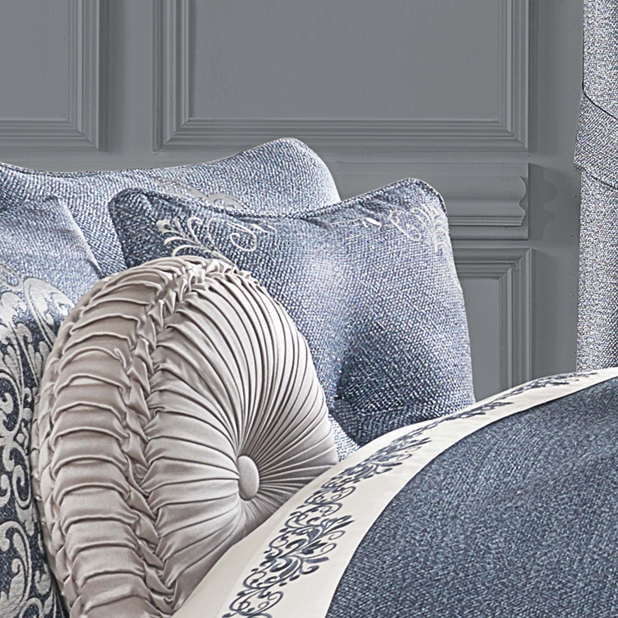 The Richmond 18” Decorative Embellished Throw Pillow Is Unique And Sophisticated With A Scroll Border Embroidery Design Across The Four Corners. The Front And Back Of The Pillow Both Feature A Deeply Tufted Button Detail. The Beautiful Embroidery On The Pebbled Woven Indigo Fabric With A Metallic Heathered Look, Is A Perfect Accent Piece For Your Home Decor. The Pillow Is Overstuffed And Finished With Indigo Piping. Pair This Pillow With The Richmond Bedding Set By J. Queen New York For A Complete Look.