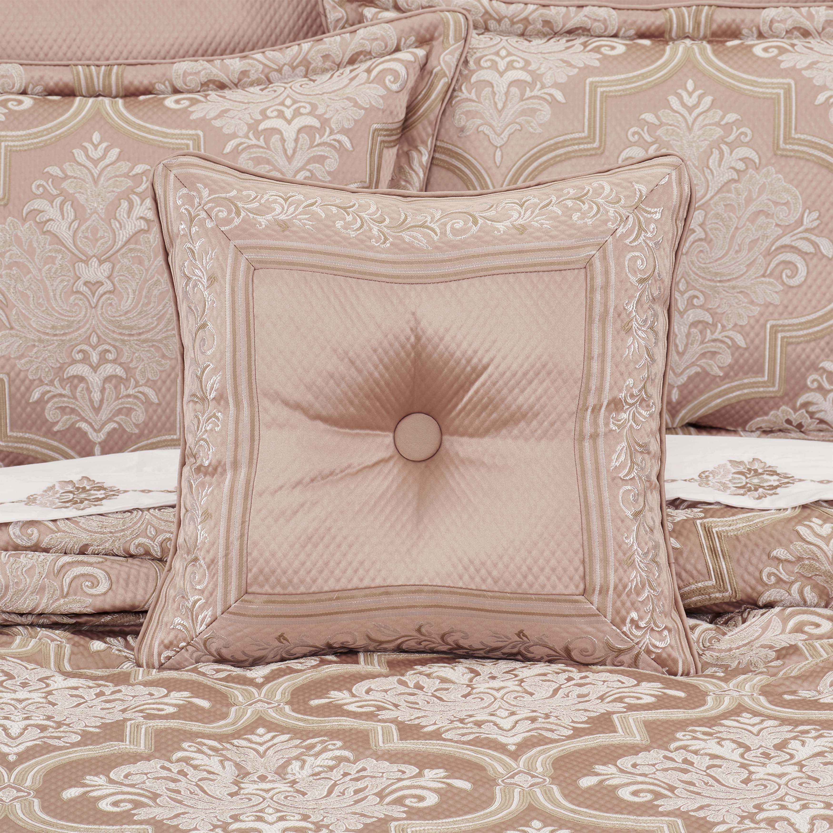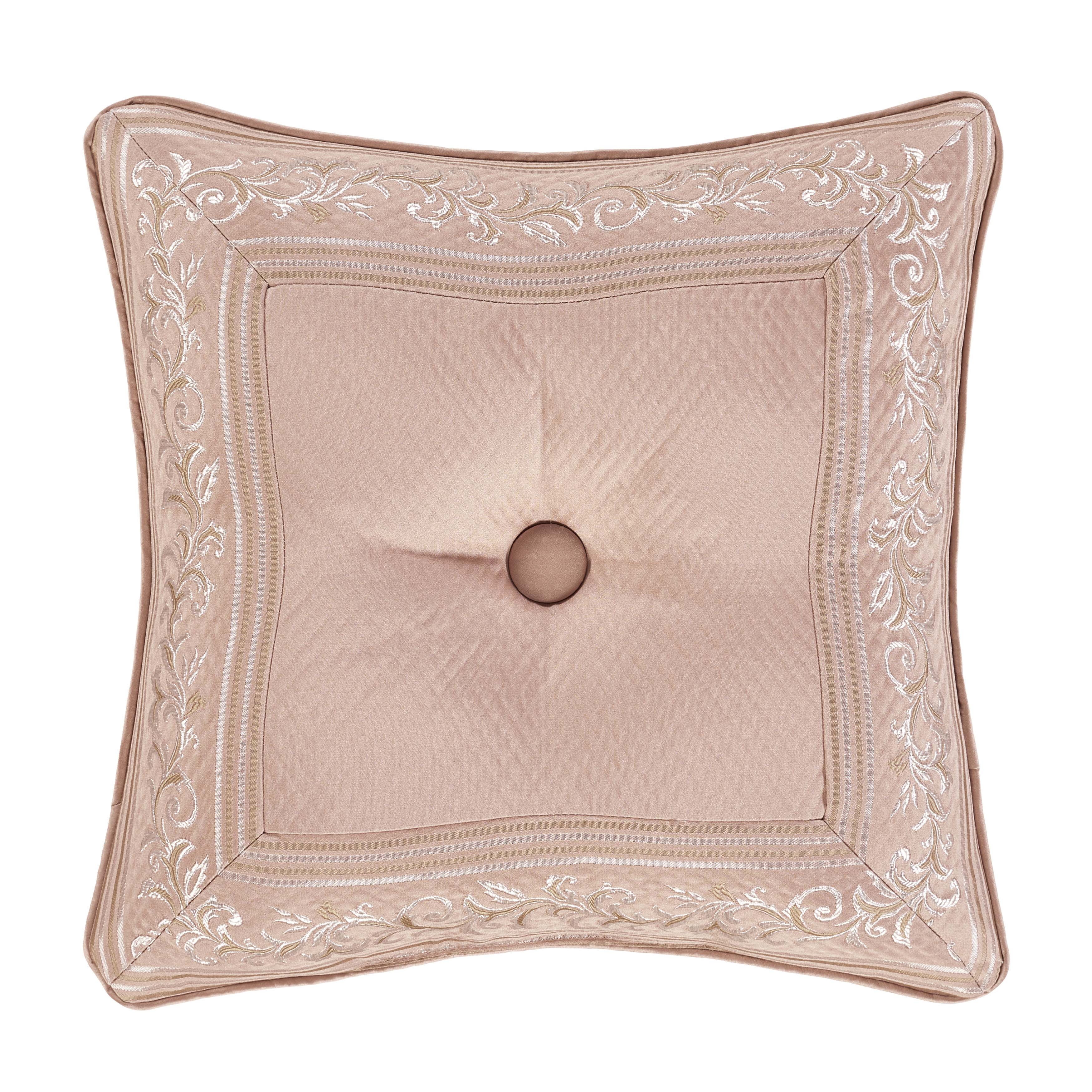 inspired by european elegance, the rosewater 18″ decorative throw pillow features a classic damask border pattern, which incorporates a unique weave technique giving the appearance of antique polished metals in white and rose gold. a tufted button with dyed to match blush satin piping finishes the lofty throw pillow. this luxurious accent pillow is recommended to add as the finishing touch to the rosewater bedding set.