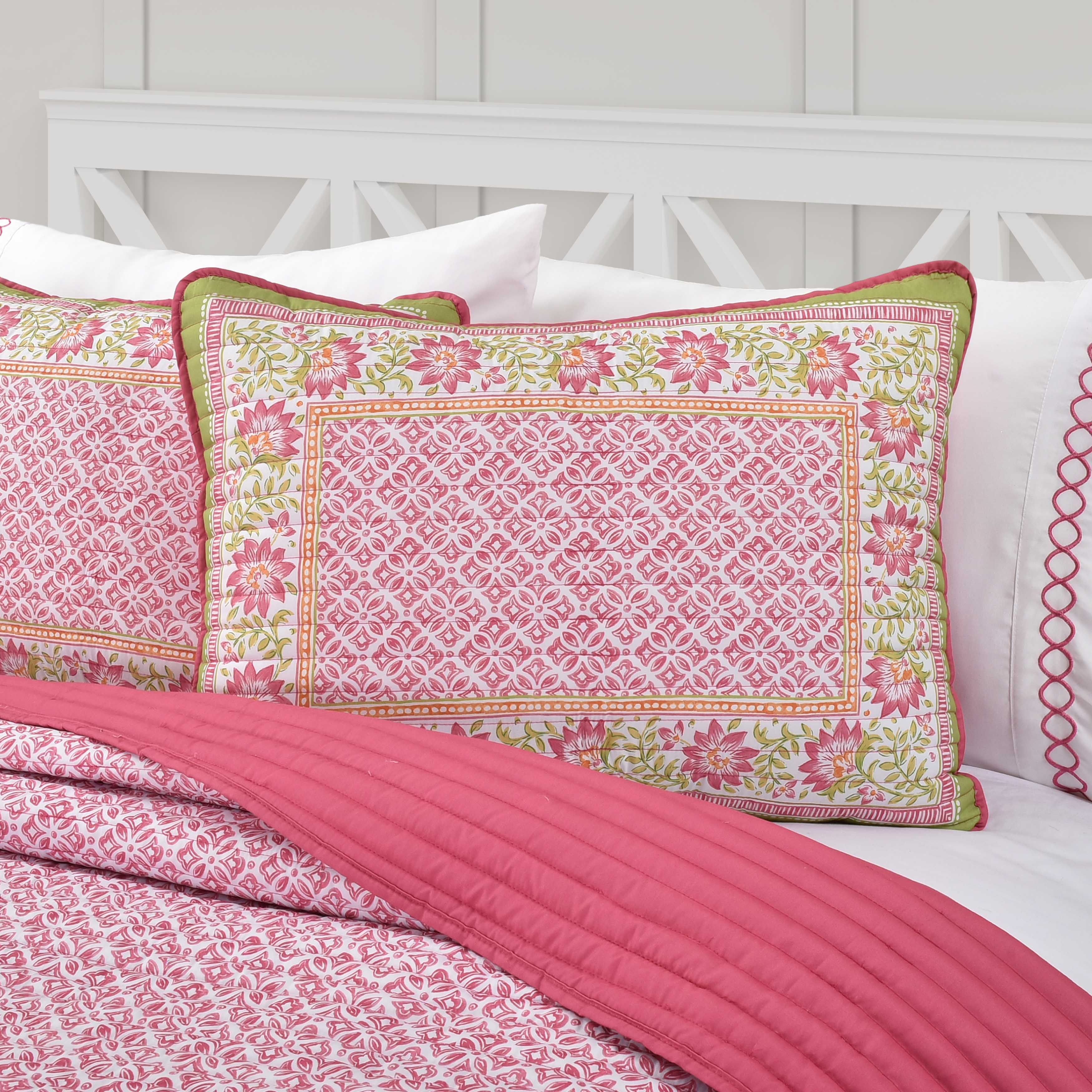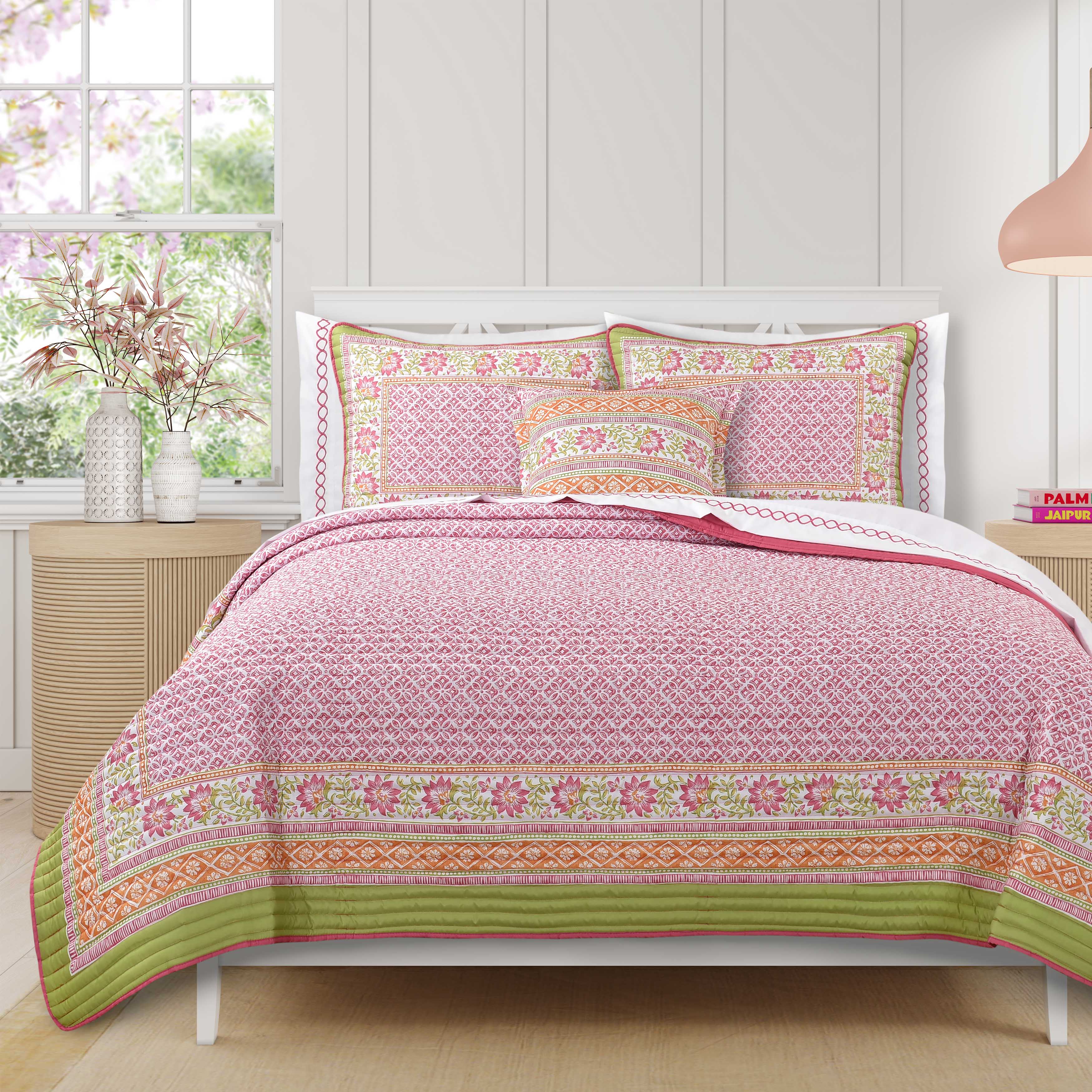 Featuring a delightful floral and geometric print, this lightweight 3-piece quilt set brings a cheerful and refreshing vibe to your space. Constructed from soft and durable microfiber and quilted with a 1€� stripe pattern, this design showcases vibrant pinks, greens, and oranges, making it a standout piece in any room. The shiloh quilt set includes one quilt and two shams (one sham for twin size), ensuring your bedroom feels like a reflection of your bold style every night.