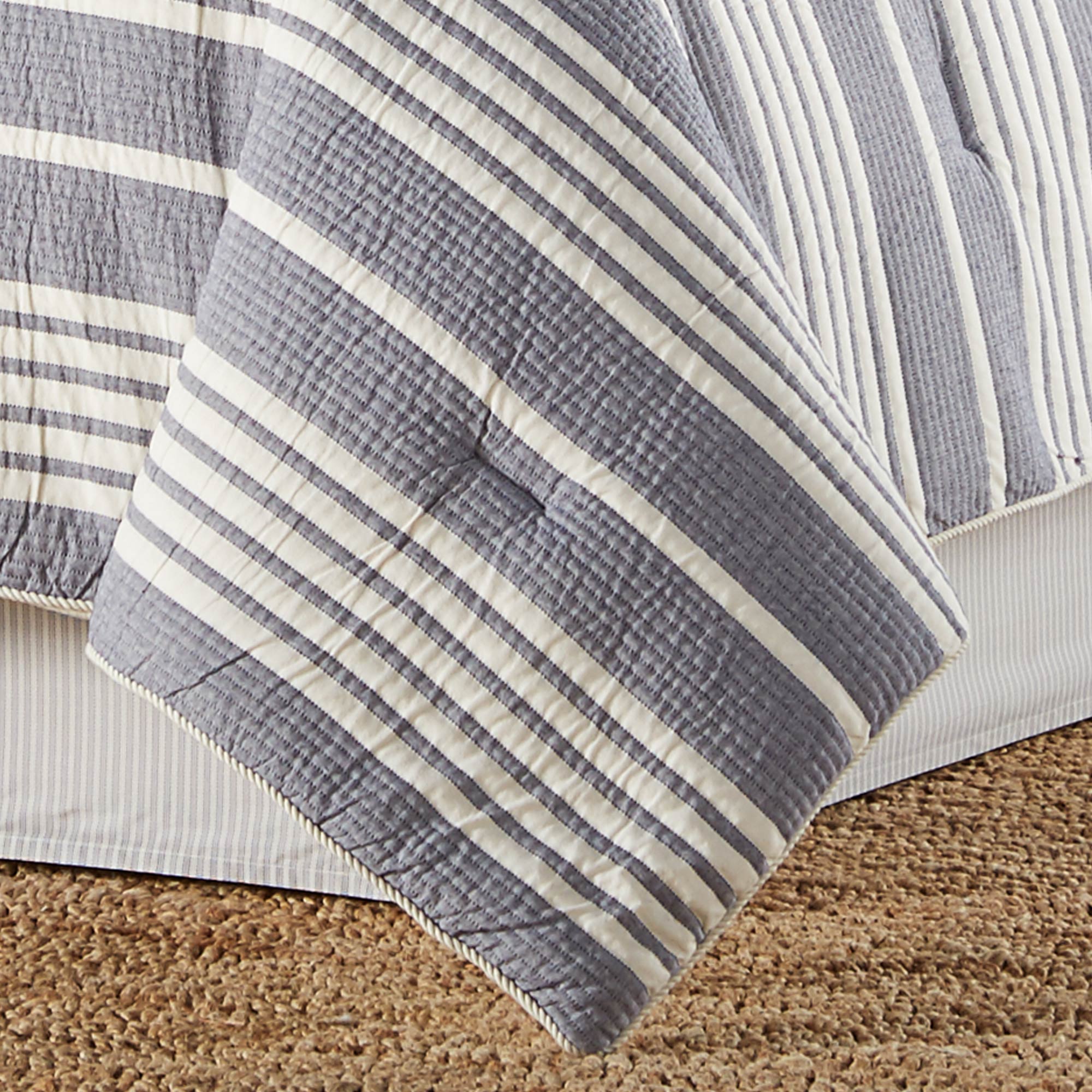 The Shore 4 Piece Comforter Set Bedding Collection Is Cool, Casual, And Coastal. The Comforter Features A Cotton/Poly Broad Stripe Matelassé In Navy And Ivory. Finished Off With A Cotton Twist Cord To Enhance The Coastal Theme, This Oversized Comforter Is Warm And Cozy For A Brisk Ocean Breeze Feel. Paired With Matching Broad Stripe Matelassé Hidden Zipper Shams With Cotton Twist Cord And A Bedskirt Printed With A Ticking Stipe On A Cotton Base Cloth. The Bedskirt Has Split Corners And A 15” Drop. Pair This Comforter Set With The J. Queen New York Shore Window Treatments, Throw Pillows, And Euro Shams For A Complete Look.