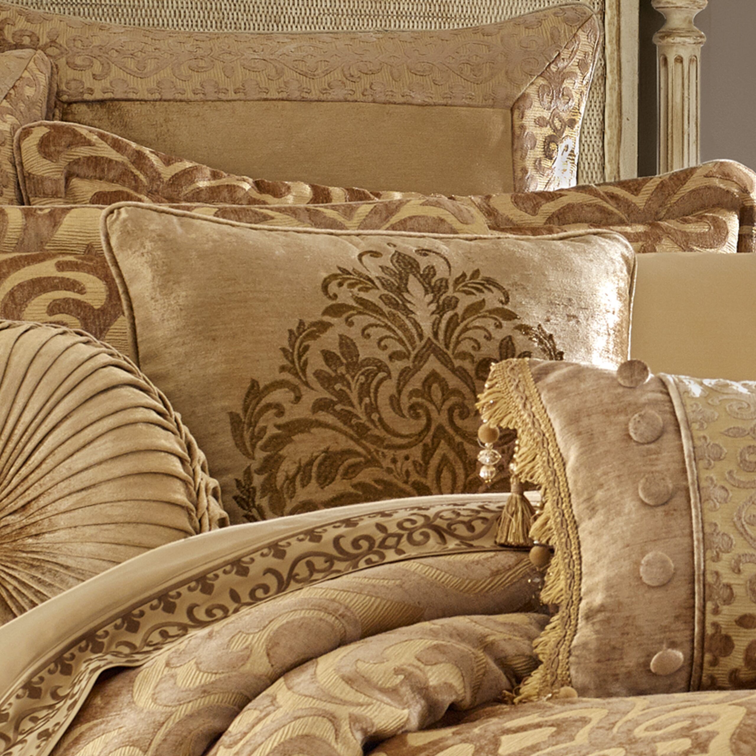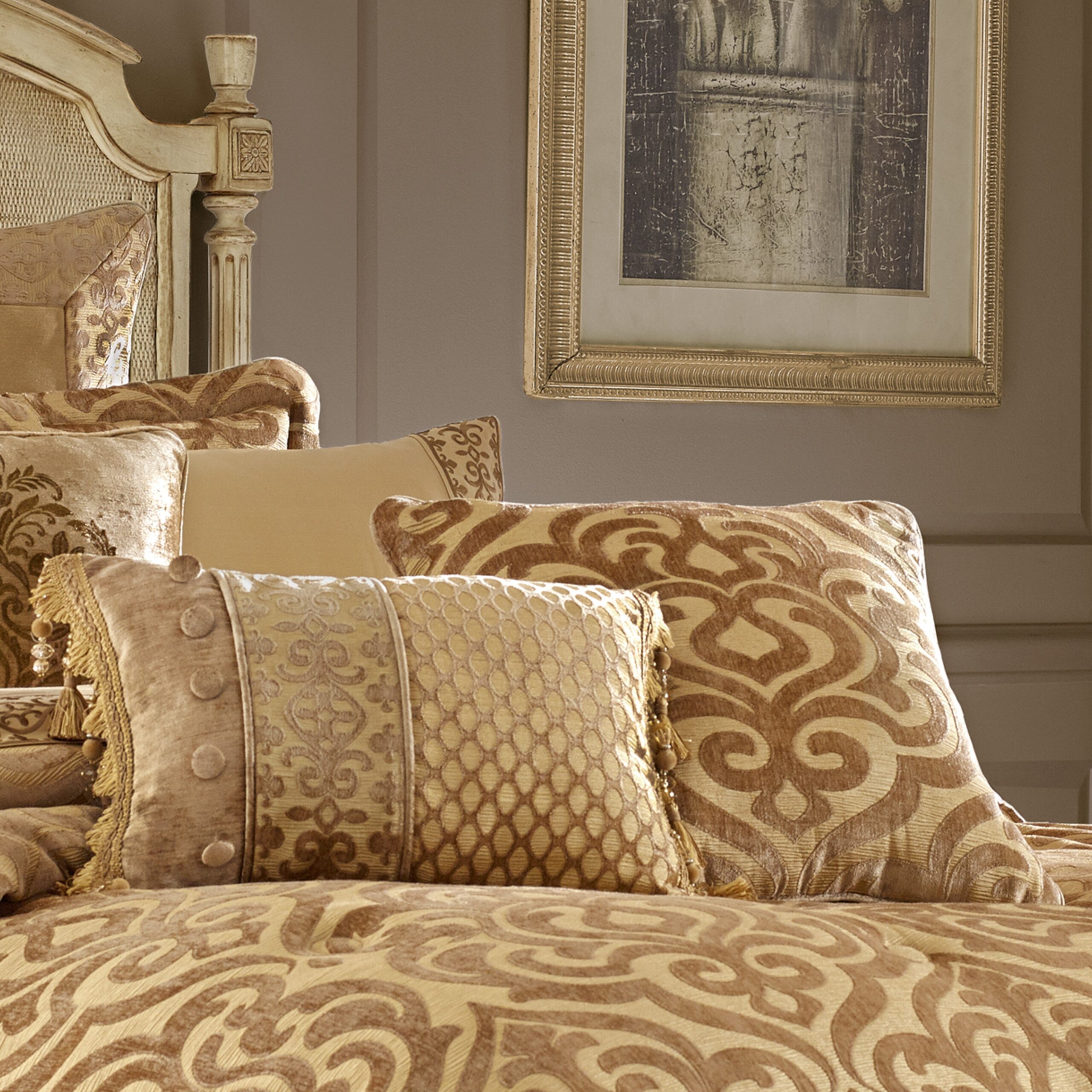 Sicily is a woven damask. The woven pattern combines a gold chenille motif with a light gold crushed technique in the ground. The oversized comforter is embellished with a solid gold chenille piping.