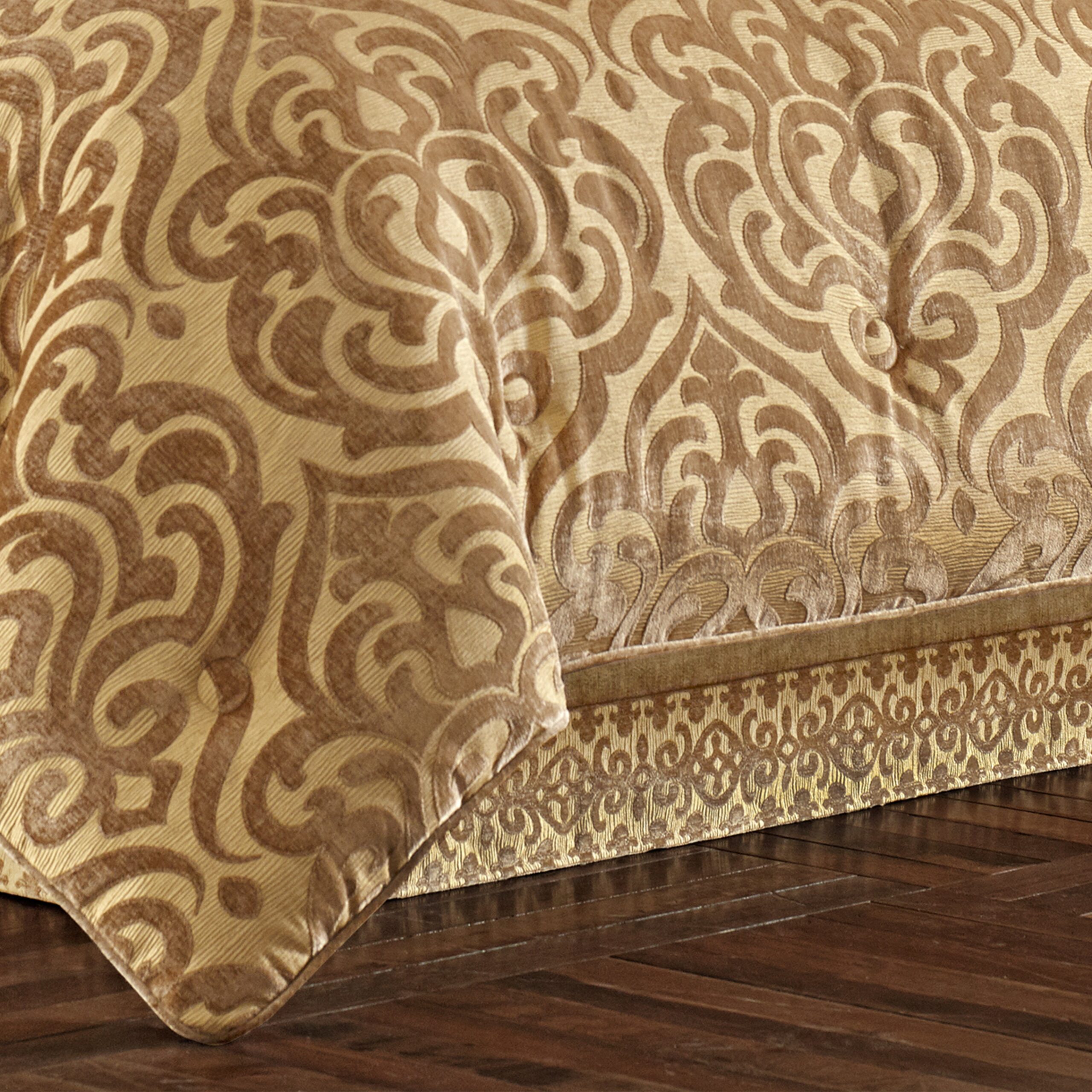 One beautifully designed comforter. Two perfectly matched padded pillow shams with a hidden zipper. Pillow shams are engineered to offer a one of a kind decorator look, centering the woven damask with solid gold chenille piping. The bedskirt is solid gold chenille with a decorative bordered stripe, containing split corners and a 15” drop.