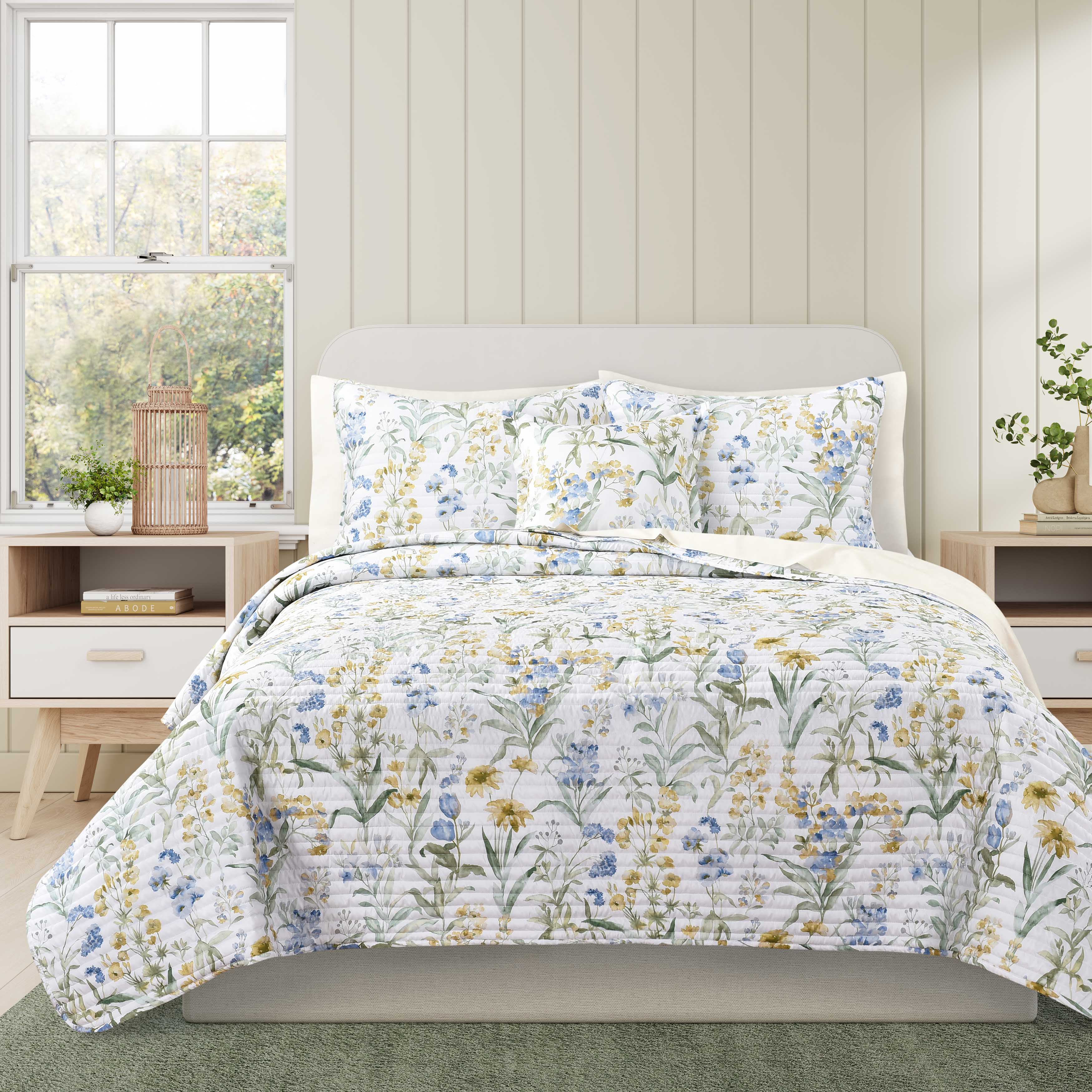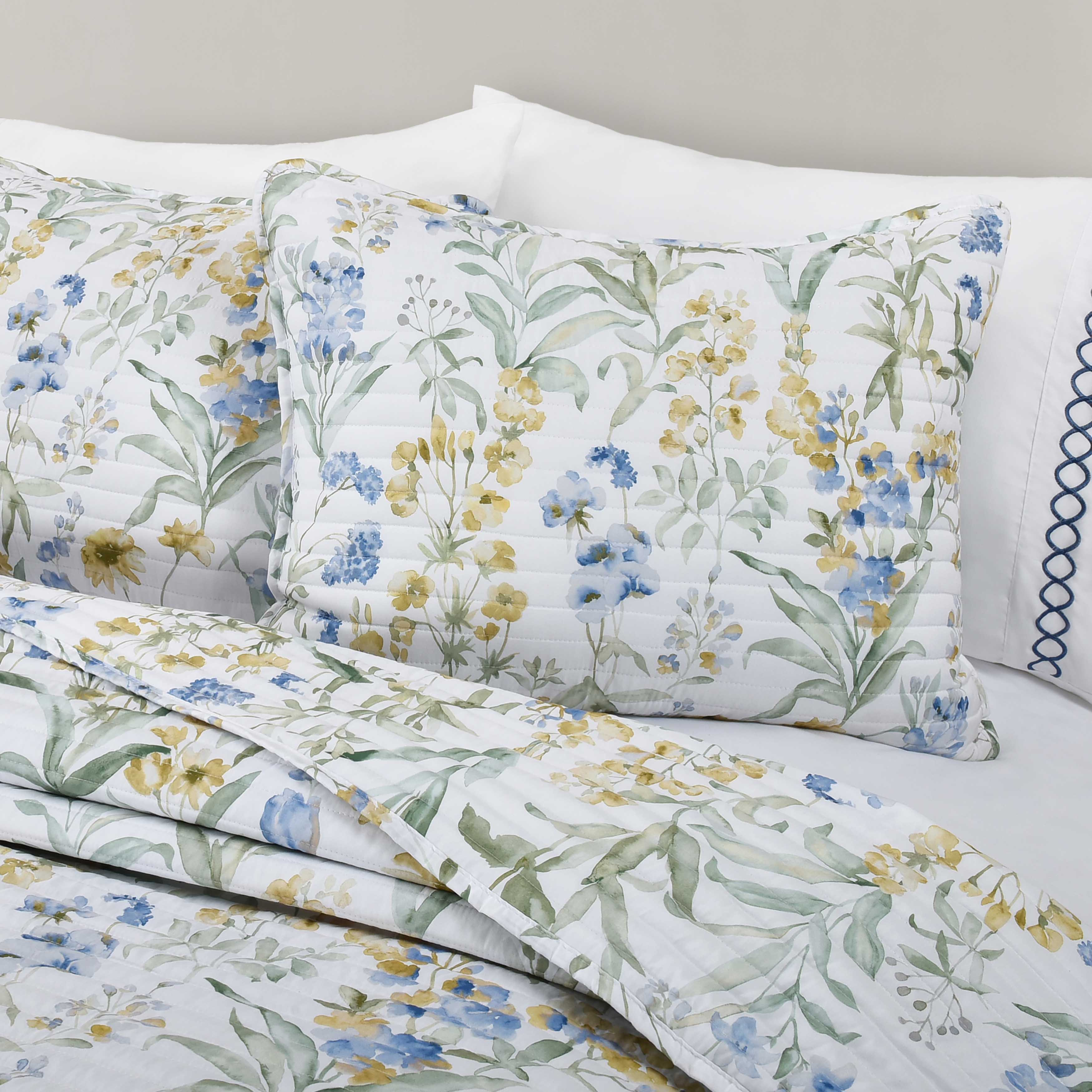 Elevate your bedroom decor with the tallulah quilt set, a perfect blend of elegance and charm. The quilt features a beautiful, delicate floral pattern in shades of blue, yellow, and green, bringing a garden-like ambiance to your sleep space. Crafted from luxurious, breathable fabric, this set ensures both comfort and durability, making it ideal for year-round use. The set includes a quilt and two matching pillow shams (one for twin size). Transform your bedroom into a serene retreat with this stunning quilt set, perfect for those who appreciate timeless floral beauty and exceptional comfort.