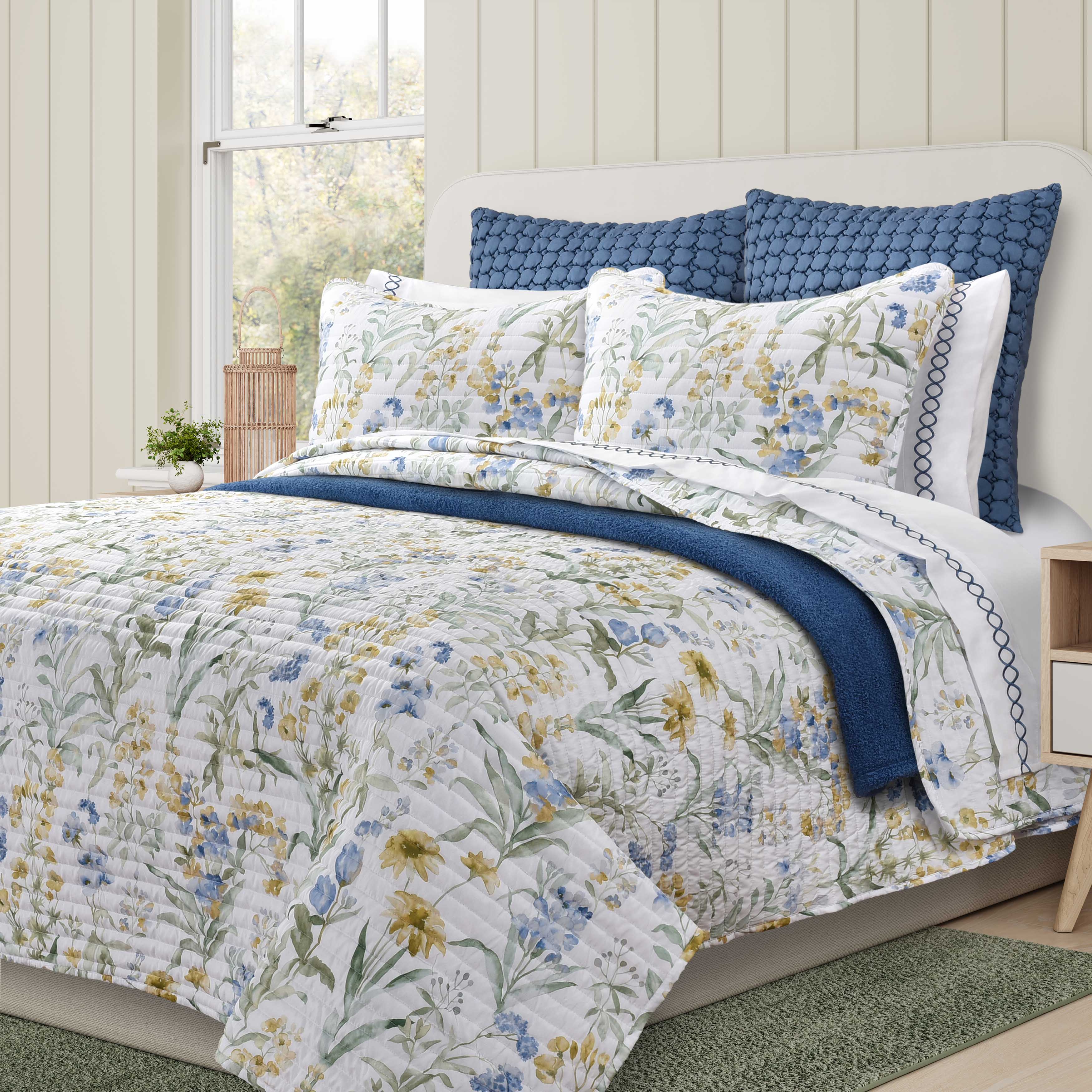 features a beautiful, delicate floral pattern in shades of blue, yellow, and green, bringing a garden-like ambiance to your sleep space