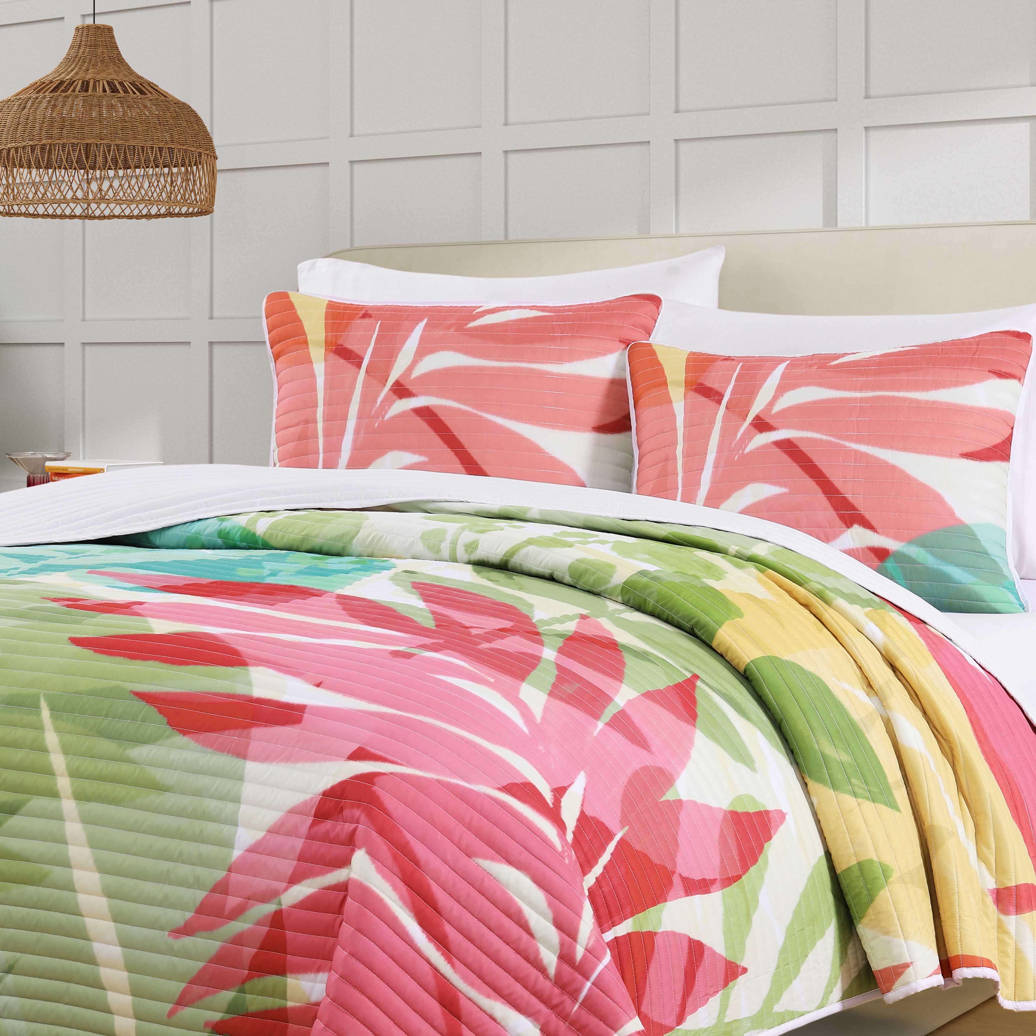 Transform your bedroom with the vibrant tropical tiki quilt set. Featuring a refreshing color palette that is crafted for comfort and style. Constructed with a durable yet soft lightweight fabric that is channel quilted, this nature-inspired design brings a resort-like feel to any space. The set includes coordinate pillow shams and it is available in a stunning fuchsia or green color option (euro shams and throw pillow sold separately).