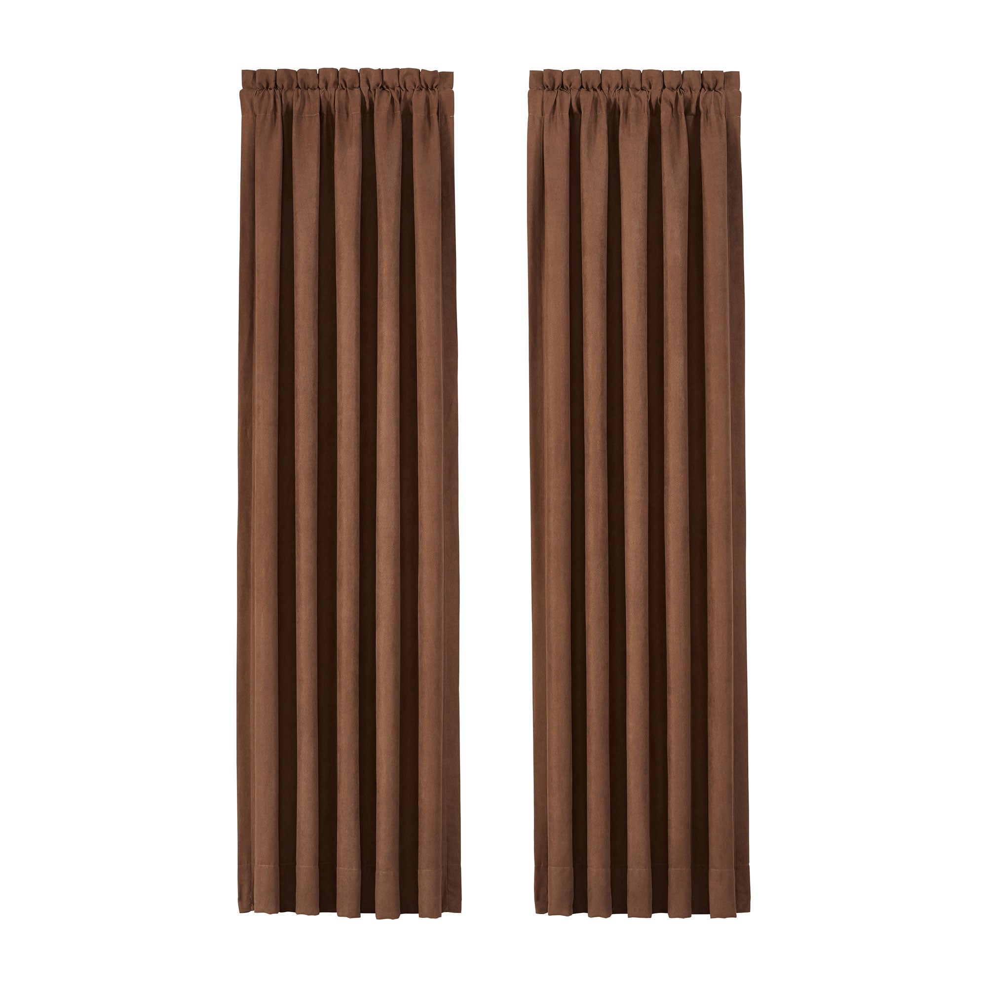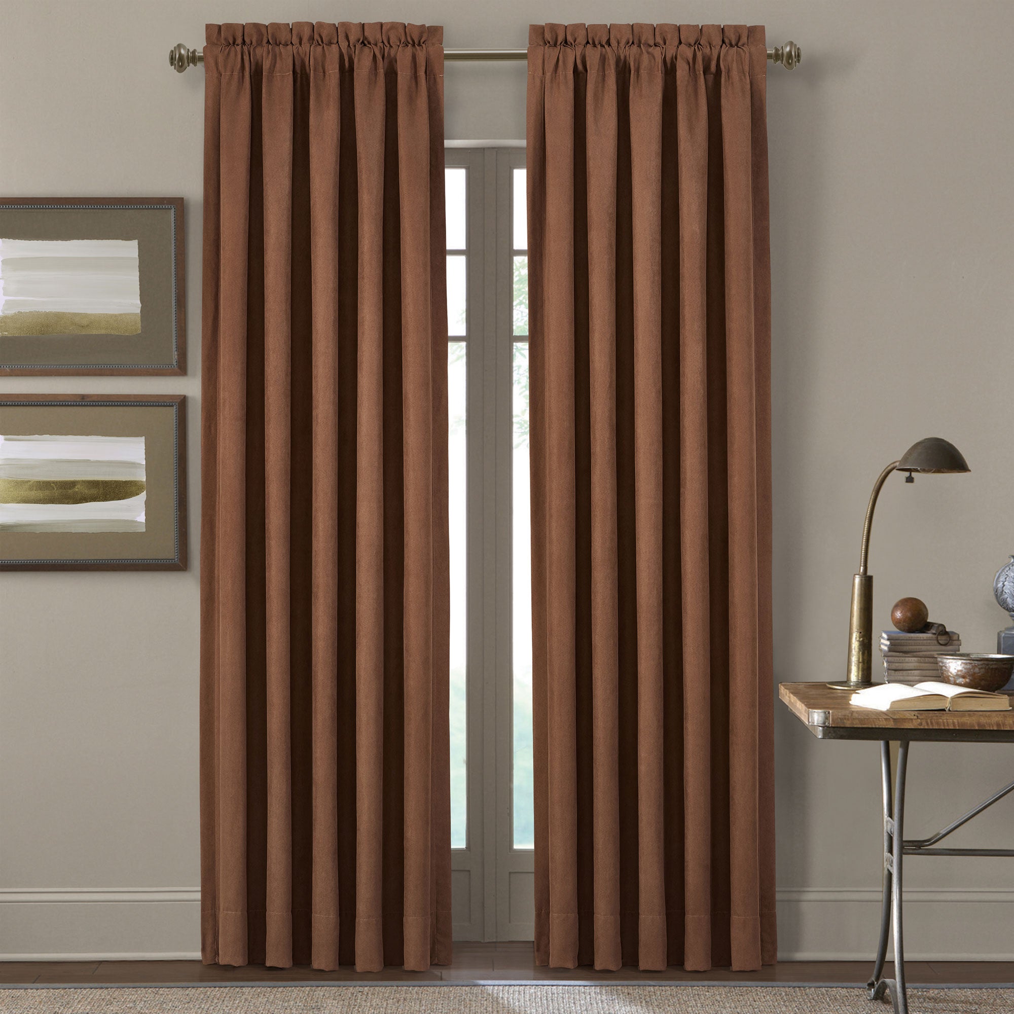 The Timber Panel Pair is made using faux suede. This suede has a beautiful drape and soft hand making them a perfect accompaniment to this rustic ensemble.